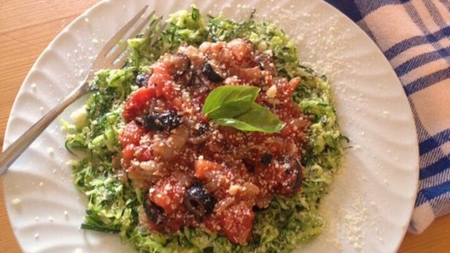 If you’re watching your carbs or can’t eat gluten — and you’re missing your pasta — then you’ll love zucchini pasta, or “zoodles.” It’s easy, simple, healthy and an exciting way to get more vegetables into your diet. Topped with a puttanesca-style sauce, you’ll never know you’re eating zucchini!