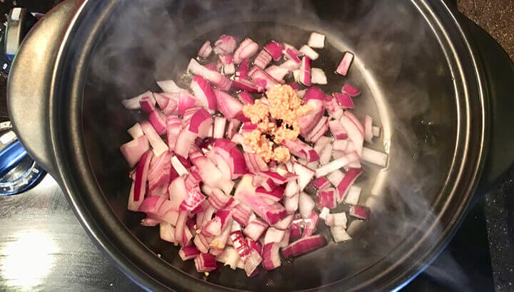 2. When hot, add the onion and garlic. Saute for a couple of minutes.