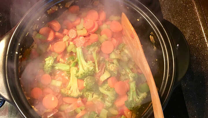 7. Bring to a boil, then reduce heat. Simmer for 15 minutes or until veggies are soft.