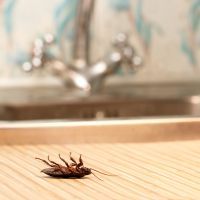 Dead cockroaches in an apartment house on the background of the water faucet. Inside high-rise buildings. Fight with cockroaches in the apartment. Extermination.