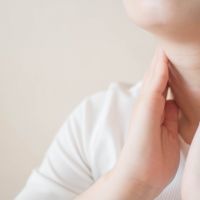 Female checking thyroid gland by herself. Close up of woman in white t- shirt touching neck. Thyroid disorder includes goiter, hyperthyroid, hypothyroid, tumor or cancer. Health care. Copy space.