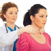 Female checking thyroid gland by herself. Close up of woman in white t- shirt touching neck. Thyroid disorder includes goiter, hyperthyroid, hypothyroid, tumor or cancer. Health care. Copy space.