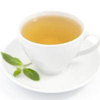 green tea in white cup on top of a white background.