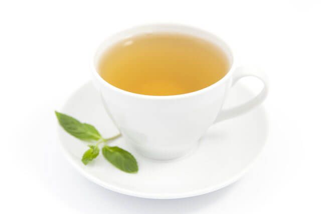 green tea in white cup on top of a white background.