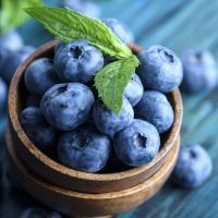 Bowl of fresh blueberries on blue rustic wooden table closeup.