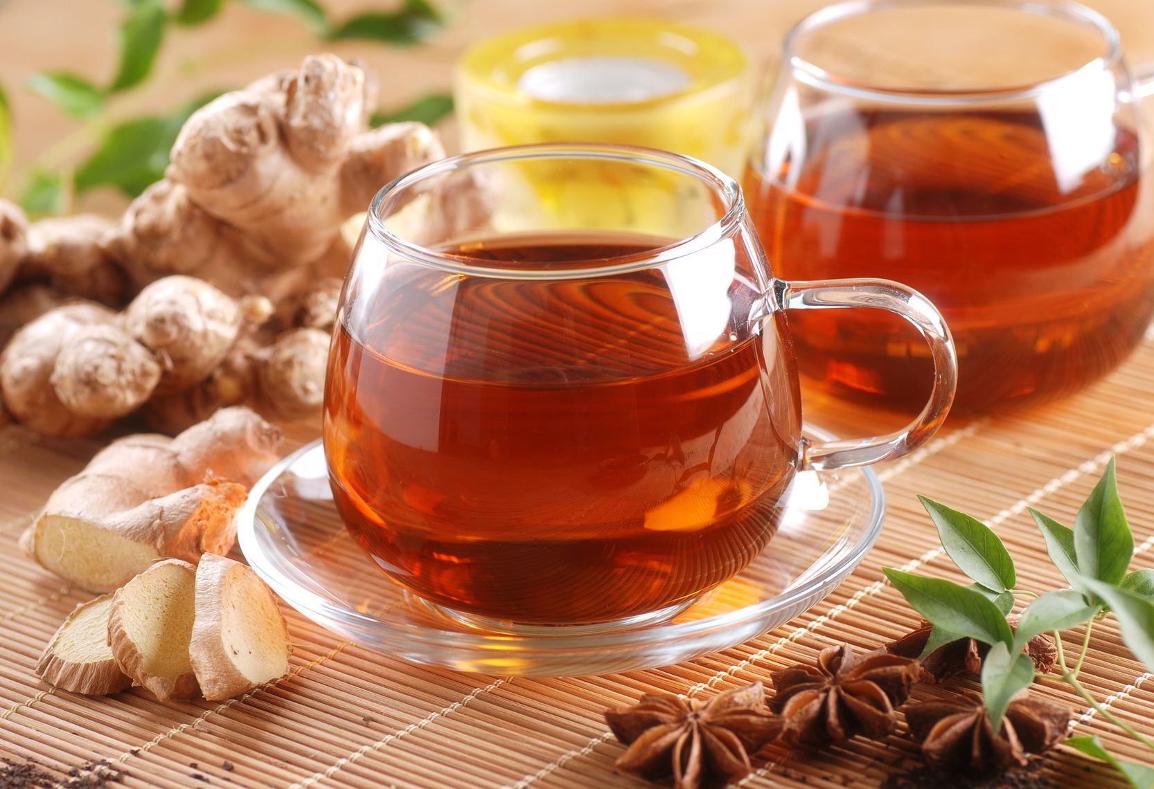 tè allo zenzero nella tazza di vetro con ingredienti intorno