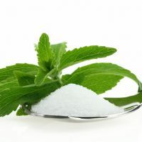 Fresh Stevia Rebaudiana and sugar in a spoon