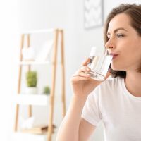Morning of beautiful young woman drinking water in bedroom