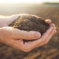 Handful of arable soil in hands of responsible farmer