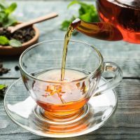 Pouring black tea into glass cup on wooden table