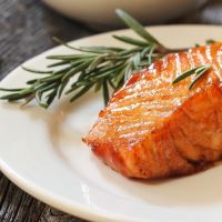 Pan fried salmon with Rosemary garnish, selective focus