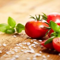 Tomatoes lying on old table. Diet food