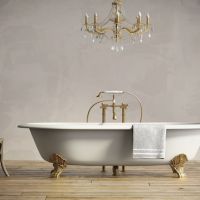 Classic bathtub with chandellier and aged wood floor