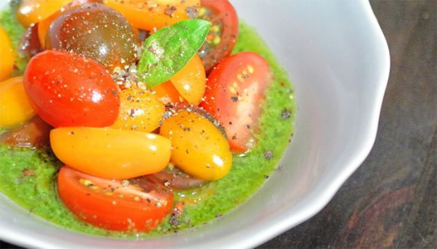 When it comes to a vinaigrette, there are no rules and that’s half the fun of it. From oils to herbs, spices to citrus fruits, there are so many possibilities. For this dressing, we used plenty of fresh basil straight from our garden, olive oil, garlic, lemon, sea salt and pepper.