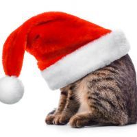 Charming young woman with cat in santa cap