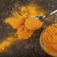 turmeric in a bowl and on a tassel, on a rustic background, a selective focus