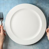 Female hands with cutlery and empty plate on color background