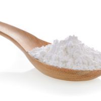 Pile of white wheat flour in wooden spoon