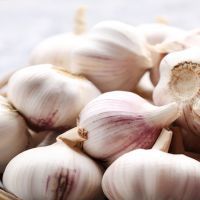 Garlic in basket on grey wooden table