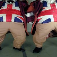 two obese people wearing union jack waistcoats